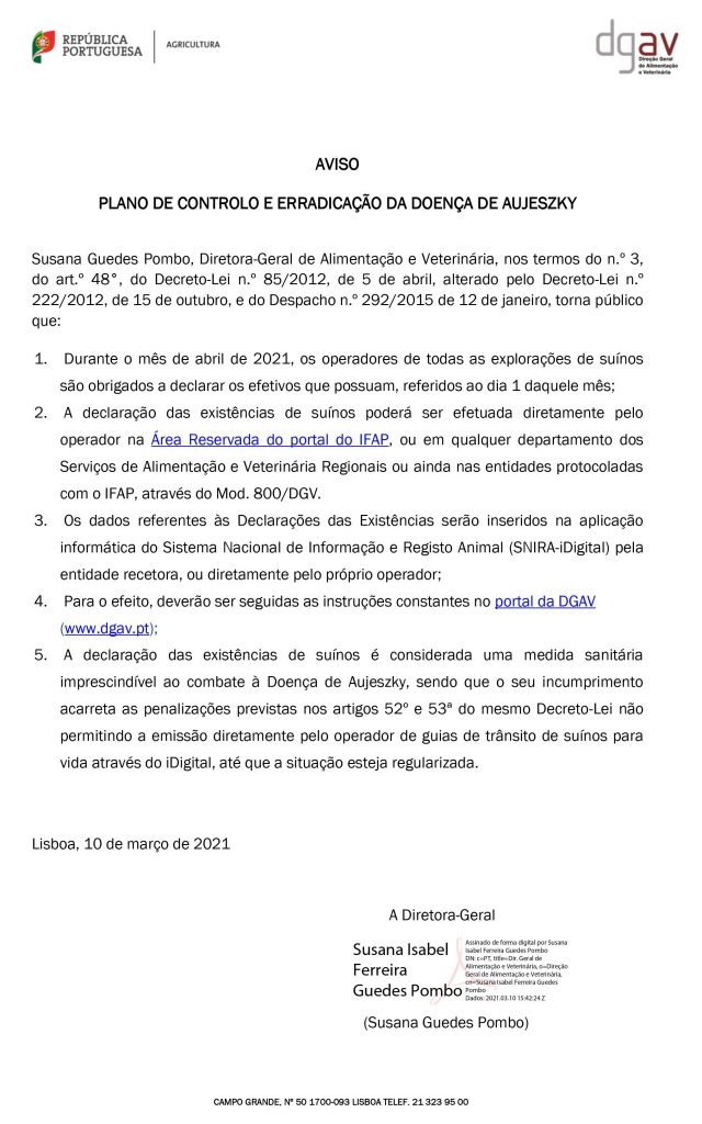 Esta obrigatoriedade é uma medida de carácter sanitário de combate à Doença de Aujeszky e, o seu incumprimento, acarreta as penalizações previstas nos artigos 52º e 53º do mesmo Decreto-Lei.