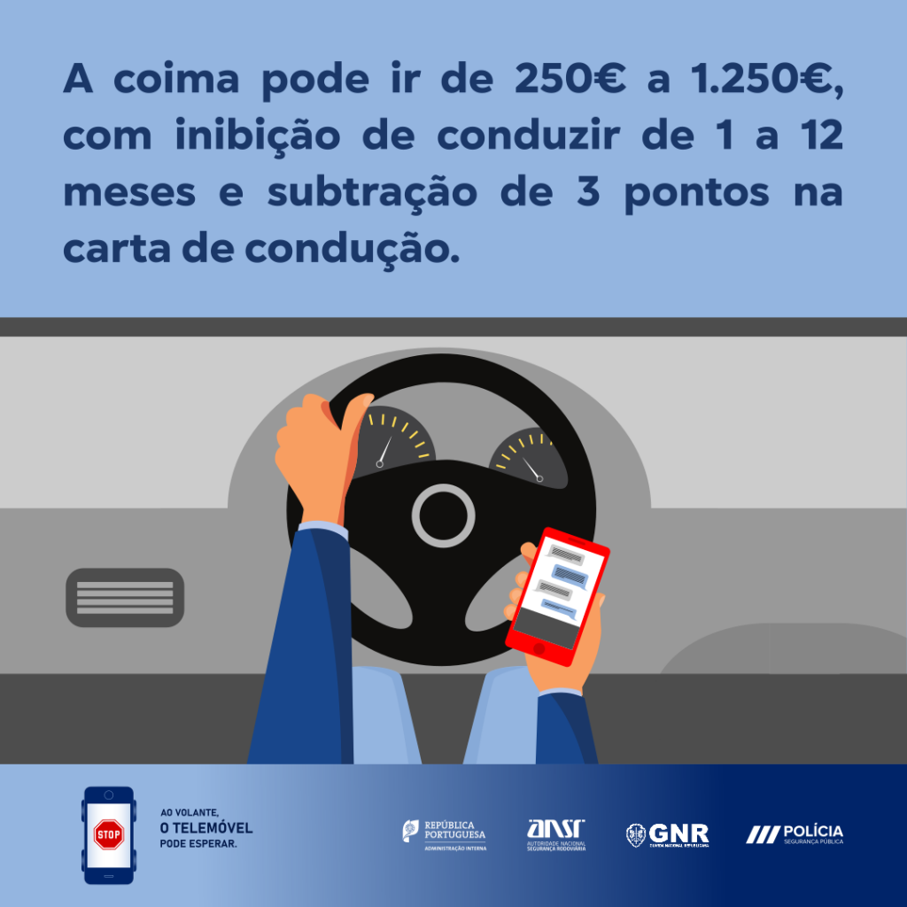 “A campanha integrada no Plano Nacional de Fiscalização “Ao volante, o telemóvel pode esperar”, a decorrer até 13 de maio tem por objetivo alertar os condutores para as consequências negativas e mesmo fatais do uso indevido do telemóvel durante a condução. A 50 km/h, olhar para o telemóvel durante 3 segundos é o mesmo que conduzir uma distância de 42 metros com os olhos vendados, o equivalente a uma fila de 10 carros. A utilização do telemóvel durante a condução aumenta em quatro vezes a probabilidade de ter um acidente, causando um aumento no tempo de reação a situações imprevistas. Para além disso, não vale a pena arriscar perder três pontos na Carta de Condução.” (Autoridade Nacional de Segurança Rodoviária).