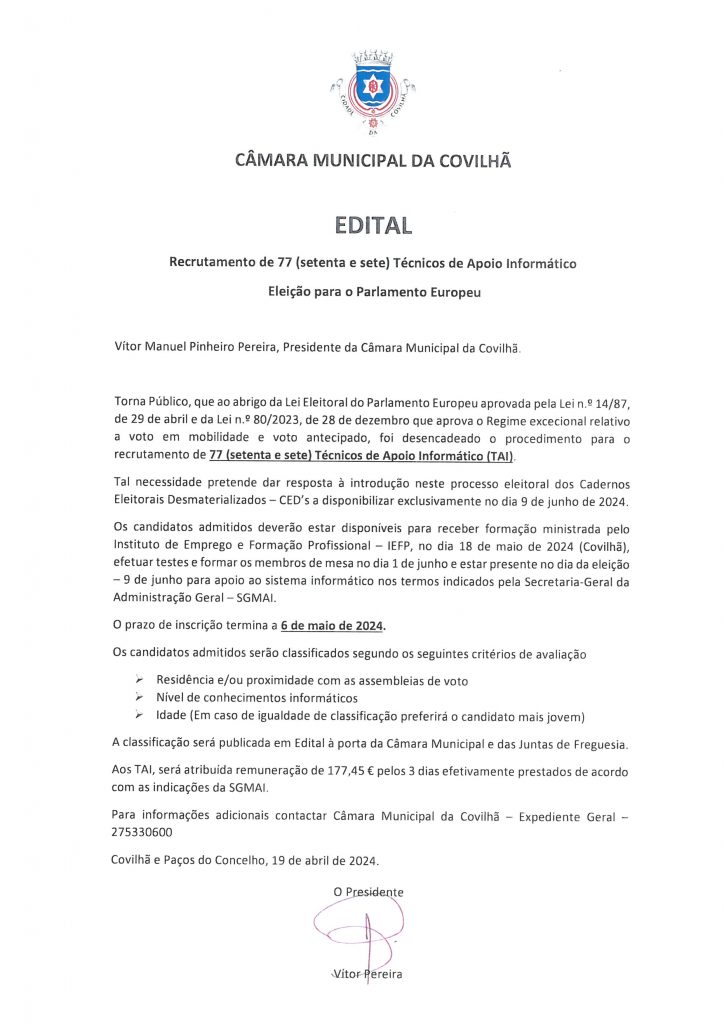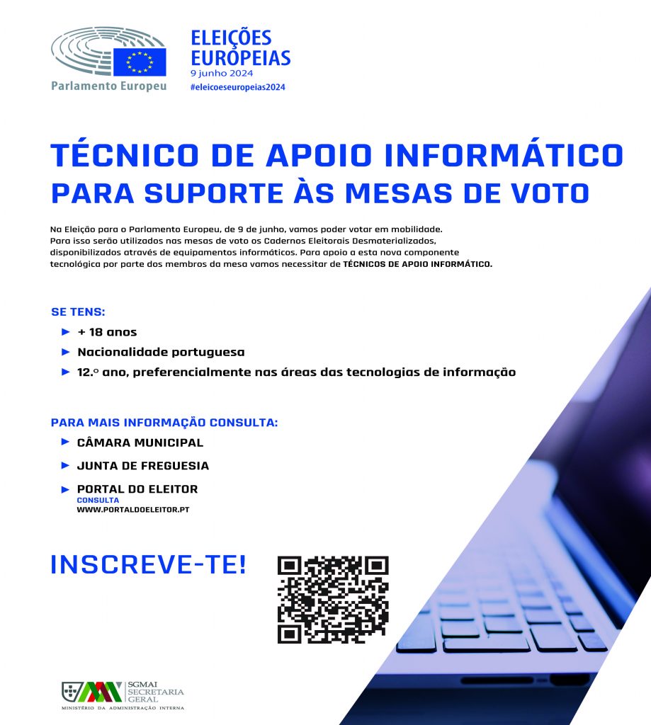 “Ao abrigo da Lei Eleitoral do Parlamento Europeu (…) foi desencadeado o procedimento para o recrutamento de 77 Técnicos de Apoio Informático (TAI).Tal necessidade pretende dar resposta à introdução neste processo eleitoral dos Cadernos Eleitorais Desmaterializados a disponibilizar exclusivamente no dia 9 de Junho de 2024.”